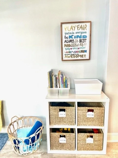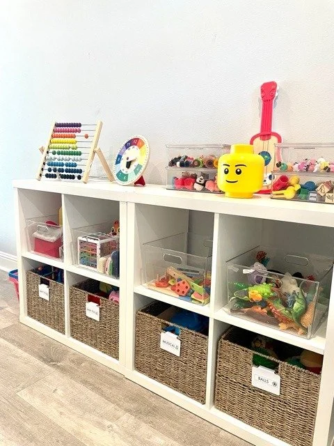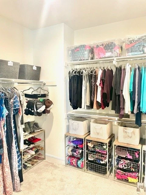 We’ve done several home organization projects for Hillary, including her home office, primary closet and kids’ closets, bathrooms, kitchen drawers, and baby/kids clothing storage. We also helped organize her playroom, including picking out furniture, storage, and soft furnishings.