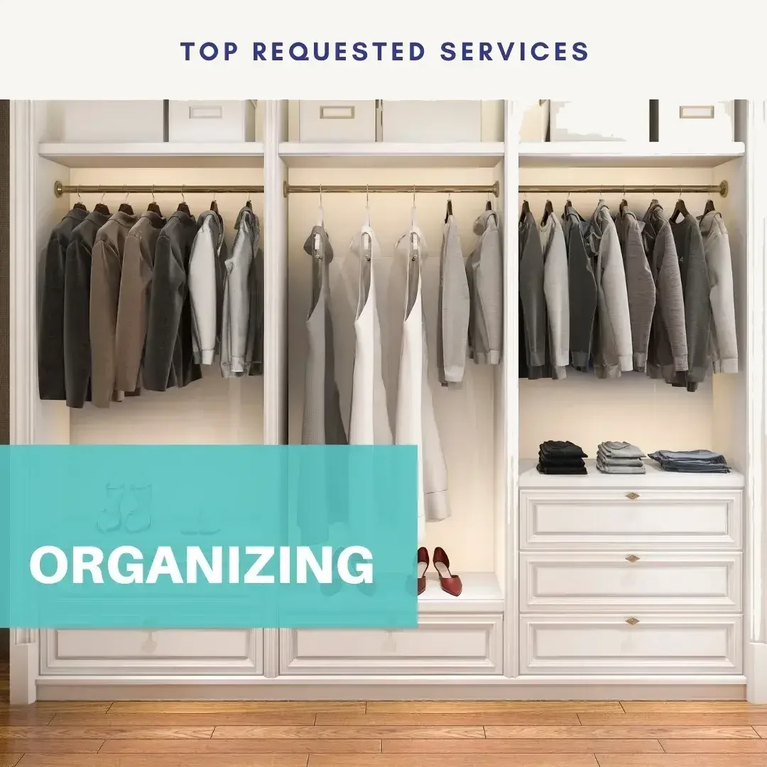 3. Organizing – We help our clients declutter and organize any room in their home from the closet to the garage. We deal with taking away donations and consignment items, as well as purchasing storage and organizing items needed to complete the task. We implement simple systems that are easy to maintain, that enable our clients to utilize their space, and stay organized.