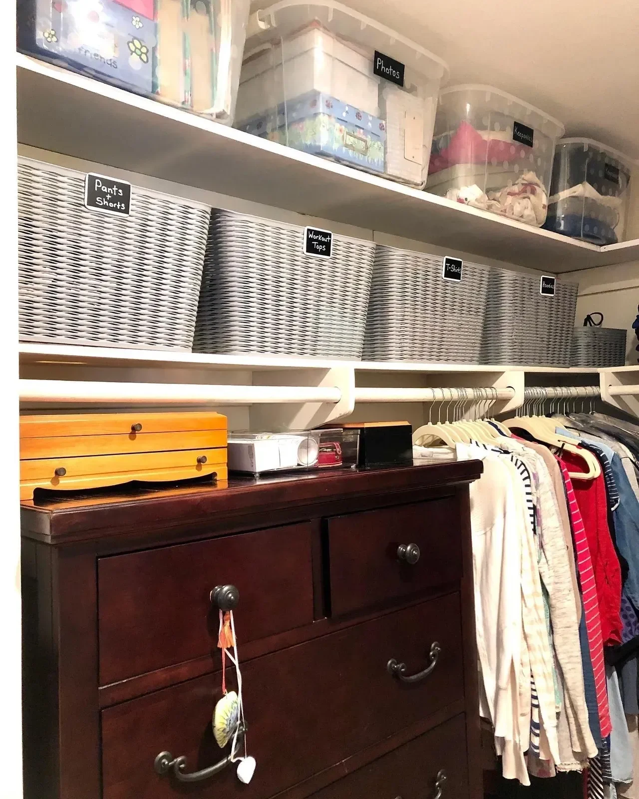 For your closet, you may want to categorize items such as T’s, pants, dresses etc. and/or also incorporate zones such as workout gear, workwear, beach, sleepwear etc.